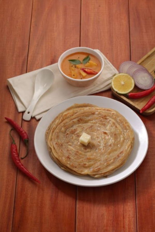 South Indian flaky paratha made with refined flour, soft inside and crisp outside.